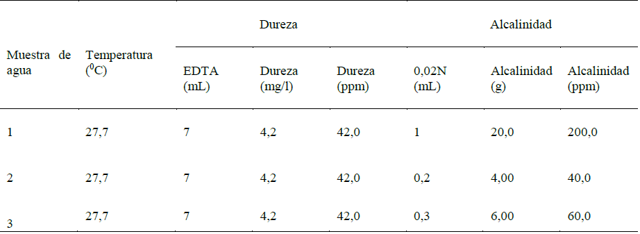 El pH fue determinado haciendo uso de un equipo medidor marca FIVEEASY-METTLER TOLEDO de fabricación china. La temperatura empleando un termómetro de mercurio calibrado y verificado en el momento de tomar las tres muestras de agua.43 La dureza fue determinada teniendo en cuenta la metodología de dureza total de calcio y magnesio en aguas superficiales, subterráneas, de mar y efluentes industriales.44 La alcalinidad (mg/L CaCO3) haciendo uso de la metodología exigida para su determinación en las mismas aguas mencionadas anteriormente.45