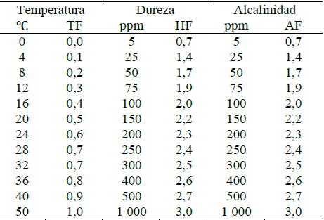 A partir de la expresión (4), para la obtención de cada uno de los factores dependientes de la temperatura (TF), la dureza (HF) y la alcalinidad (AF) fue necesario interpolar los valores de acuerdo con la expresión (5):