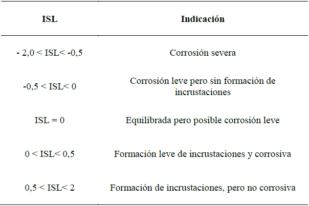 El índice de saturación de Langelier fue calculado de acuerdo con la expresión (4) y haciendo uso de los valores para cada uno de los factores que componen la expresión: 42 (Tabla 3).