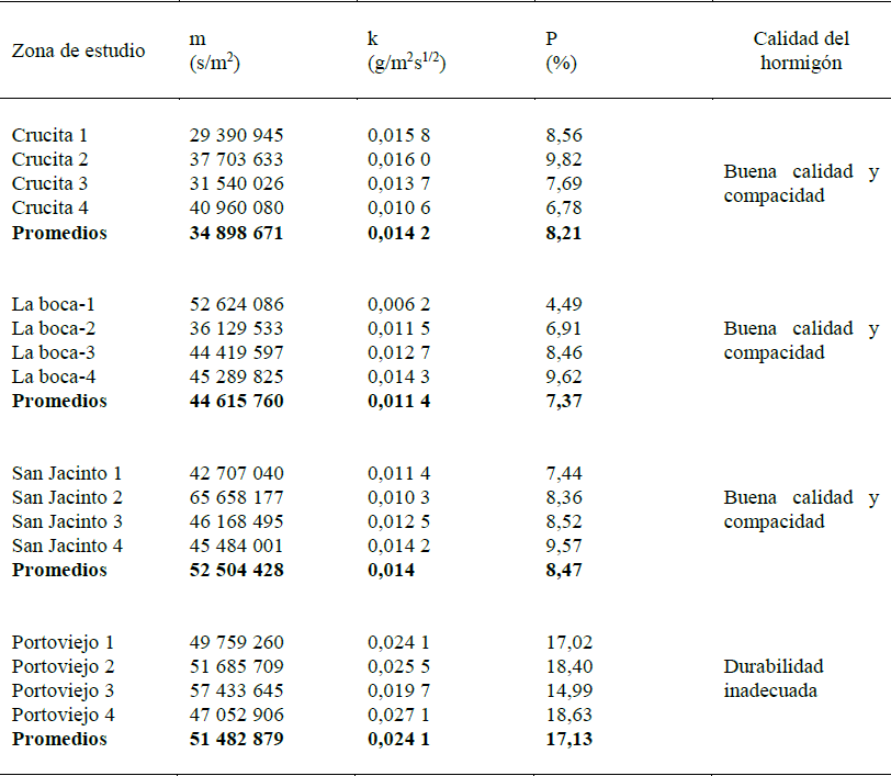 De acuerdo con los valores promedios de porcentaje de porosidad capilar obtenidos frente al agua de mar de Crucita, La Boca y San Jacinto, se está ante un hormigón de buena calidad y compacidad, según los rangos de clasificación establecidos en la RED DURAR de CyTED (Tabla 5). Sin embargo, es de apreciar un cambio brusco en cuanto a los valores de porcentaje porosidad capilar obtenido frente al agua potable de Portoviejo, superior al 15 %, lo que indica un hormigón de durabilidad inadecuada (Tabla 5).