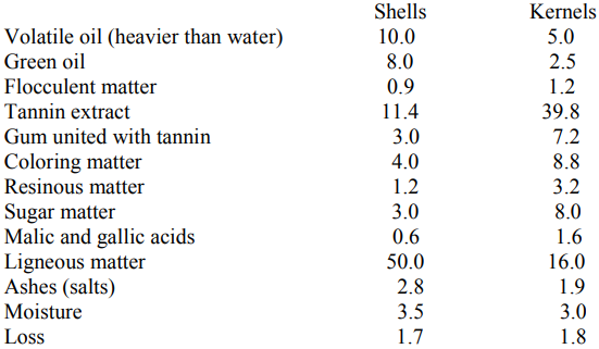 The shells were extracted with alcohol; the filtered infusion was yellow green and extremely piquant; it reddened litmus and turned brown green in the presence of ferric sulfate. Left to evaporate spontaneously it deposited a white substance joined with an oily green matter, heavier than water and having an ardent, acrid, and very piquant taste. This material was very soluble in alcohol and in ether. The husks, after being exhausted by alcohol, were seen to swell considerably when put into ammonia; the alkali dissolved a brown matter, which precipitated in brown flocks. The shells were also extracted with ether, steam distilled, etc., and the different fractions treated with iodine tincture, ferric sulfate, lead sub-acetate, gelatin, tin chloride, etc. Bonastre employed the same procedures to study the kernel of the seeds, with the following results:25