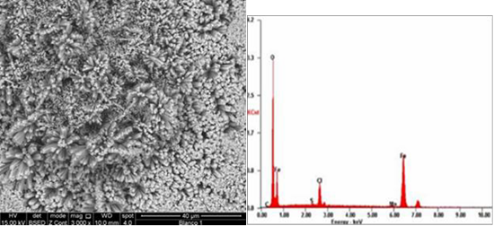 Los productos de corrosión durante la evaluación a 70 °C en presencia de H2S y CO2, conformaron una capa irregular de apariencia heterogénea. Se distinguieron diferentes morfologías: cubos alargados (Fig 3), astillas (Fig. 4), estructura floral (Fig 5), lodosa o sedimentaria agrietada (Fig. 6). Del análisis que se realizó por energía dispersiva, se evidenció que los productos de corrosión que se obtuvieron en presencia de H2S y CO2, se componen principalmente por los elementos oxígeno y hierro (Figs 3-6). El patrón de las bandas que se observaron en el espectro identificó oxihidróxidos de hierro.