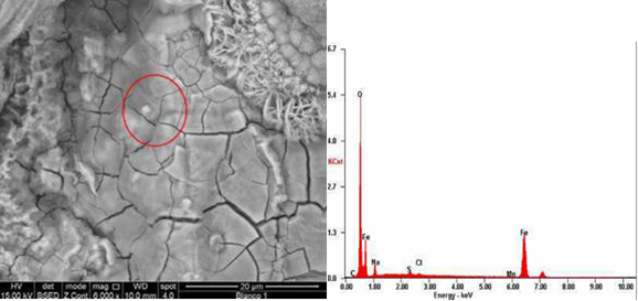 La evaluación de la morfología de los productos de corrosión y la determinación de su composición química se realizó a nivel elemental. También se emplearon las técnicas de microscopía electrónica de barrido (MEB) y espectroscopía de energía dispersiva de rayos X (EDX), mediante un microscopio electrónico de alta resolución marca FEI, modelo Quanta FEG 250, que se acopló a un detector de energía dispersiva de rayos X marca EDAX de Holanda.16