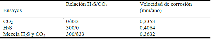 La mezcla de CO2 y H2S en las proporciones que se realizaron en la investigación si se compara con la de CO2 se aprecia que toma un valor intermedio (0, 363 2 mm/año). Esto significa que la corrosión se presenta con un valor superior a la del CO2 (0, 335 3 mm/año) e inferior a la del H2S (0, 406 4 mm/año). Nótese que la cuantía del H2S es inferior a la que se ensayó de CO2 y su afectación es notable. Lo anterior se atribuye a que ambos gases tienen limitaciones para acceder a la superficie metálica porque a la temperatura que se encuentra el sistema los dos gases están por encima de la temperatura critica, por lo que sus moléculas entran y salen a una velocidad mayor propia de su peso molecular. Sus disoluciones en el medio salino son tan rápidas como su salida.