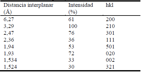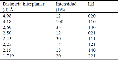 Mediante la técnica de DRX se comprobó la presencia de las fases g-FeOOH) y a- FeOOH). Ambas pertenecen al sistema cristalino ortorrómbico y grupo puntual mm2. A la g-FeOOH le corresponde una red de Bravais centrada en el cuerpo que contiene dos espejos y un eje dos de simetría y a la a- FeOOH una red primitiva.