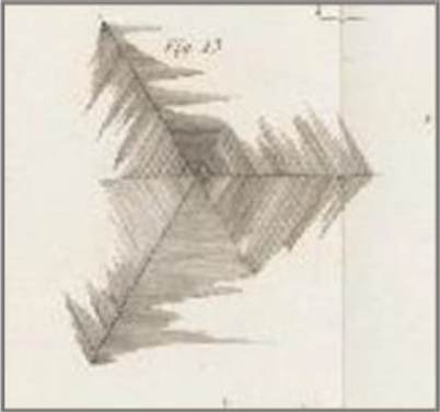During the crystallization of bismuth Baudrimont noticed the appearance of an increasing number of lines, which assumed the form of fern leaves and were more regular but less pronounced that the ones observed during the crystallization of antimony. These lines were disposed in a parallel arrangement and joined others, similarly arrayed, forming together angles of about 1200. The vertexes of the angles were aligned in the same direction and forming lines more obvious than the previous ones. All the observed arrangements produced a multitude of circumscribed hexagons, crossed by three diagonals, of which the first half of each was completely different from the second half, as shown in figure 1.