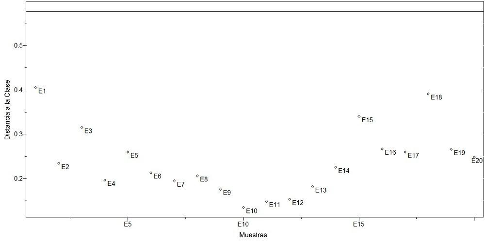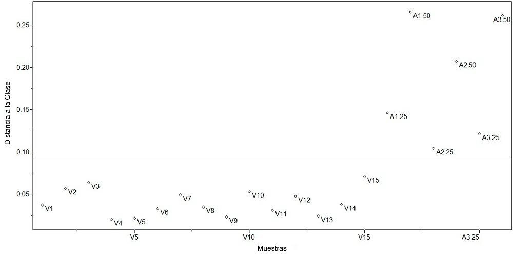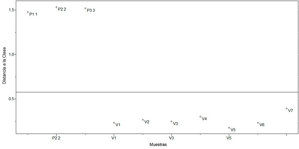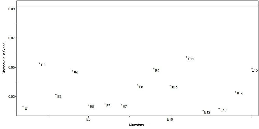 El modelo SIMCA se calculó con dos componentes principales para la clase definida anteriormente mediante el análisis PCA. Todas las muestras del conjunto de entrenamiento clasificaron correctamente (15 verdaderos positivos); no hubo muestras sin clasificar (Figura 3).