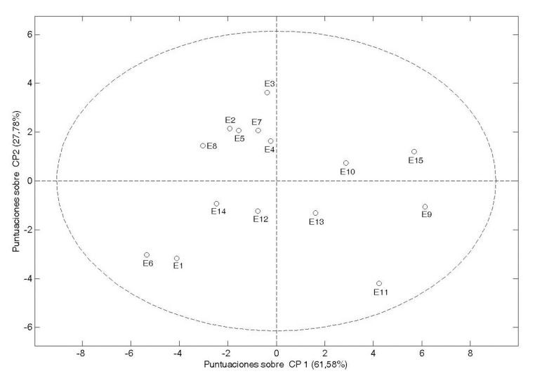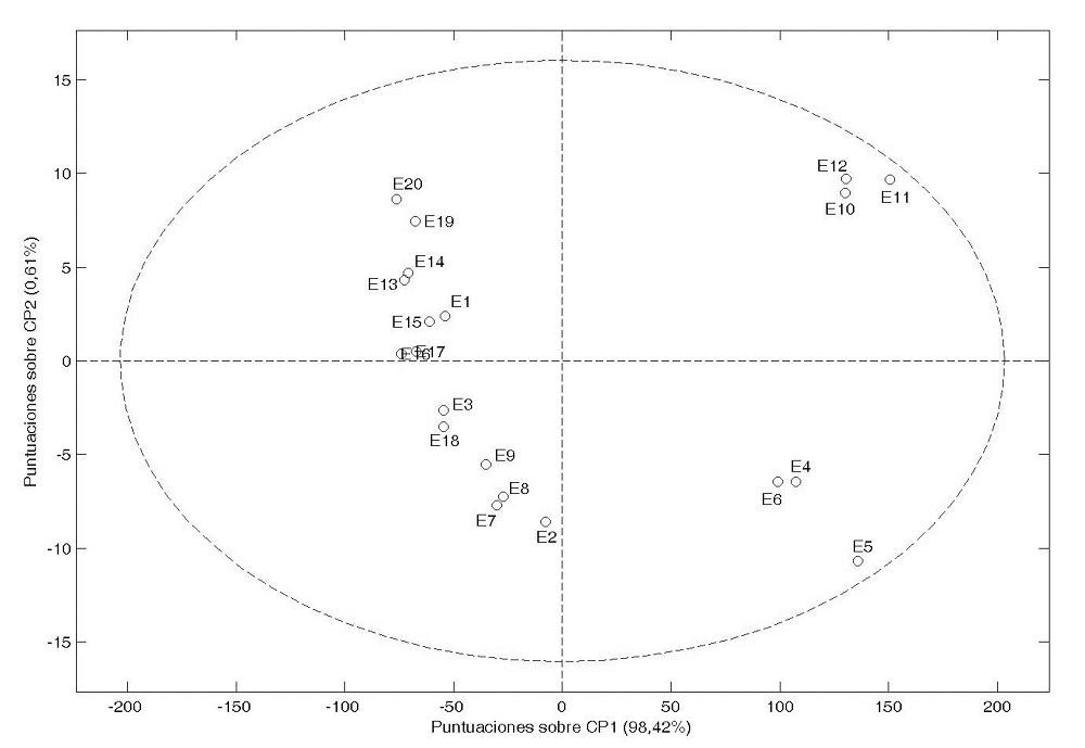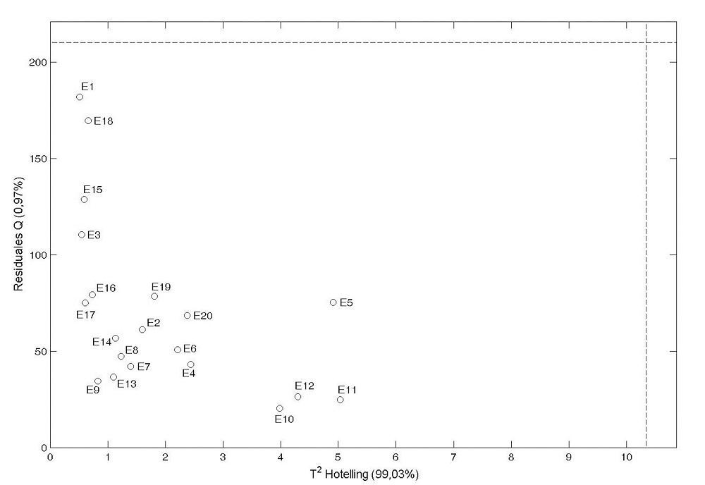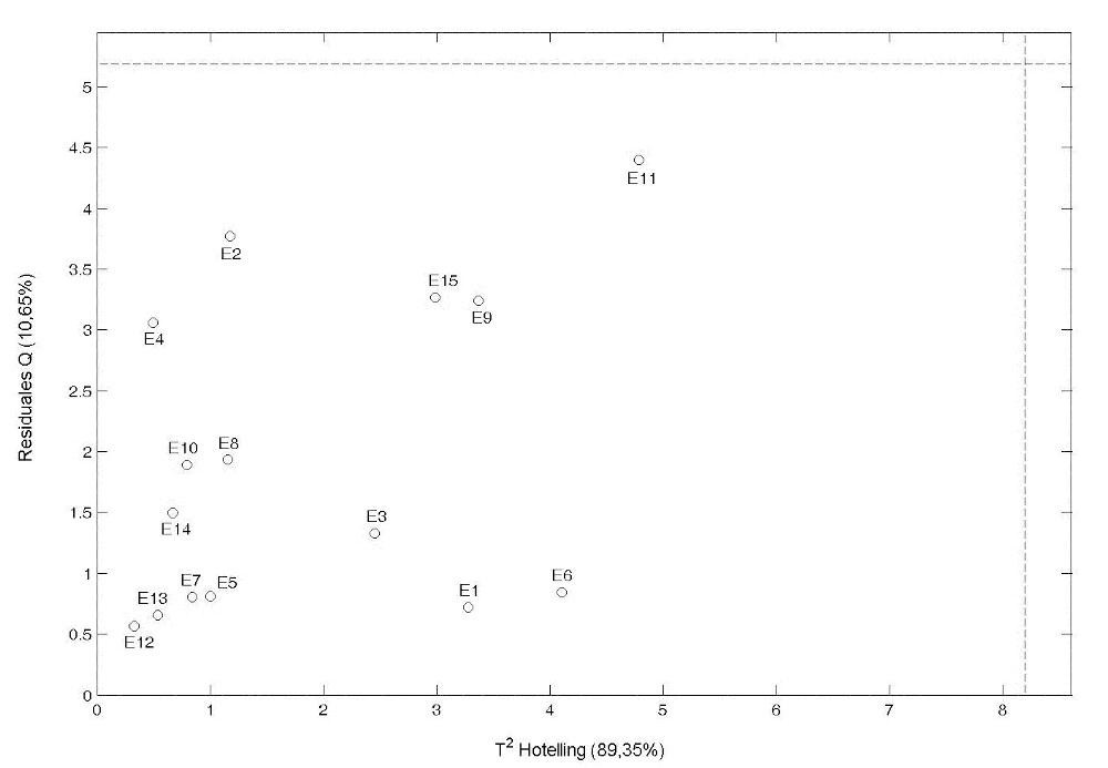 En el análisis exploratorio de datos se utilizó como método de reconocimiento de patrones no supervisado el PCA. El número óptimo de componentes principales (CP) se seleccionó teniendo en cuenta el porcentaje de varianza que cada CP acumuló. Se utilizaron los estadígrafos Q residual y T2 de Hotelling para definir la presencia de muestras o variables discrepantes. Estos estadígrafos permiten detectar si la variación incluida en los componentes principales considerados es más grande que la que correspondería si solo influyeran variaciones aleatorias.
