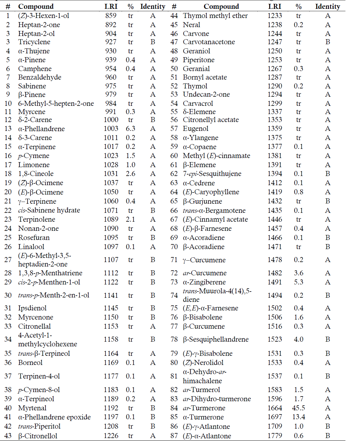A total of 88 volatile compounds were identified in the essential oil from C. longa rhizomes (98.8% of the total composition) (Table 1). As can be seen, oxygenated sesquiterpenes were the most represented class of volatiles with 63.6 %. Among them, ar-turmerone and α- turmerone were the most abundant. Sesquiterpene hydrocarbons were found as the second major chemical class (18.0%) with α-zingiberene being the main component. Another individual major constituent was the monoterpene hydrocarbon α-phellandrene.