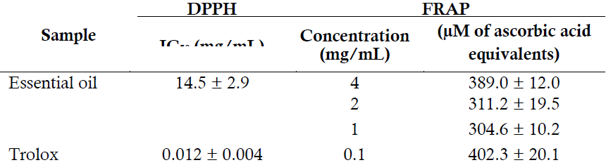 The FRAP of the essential oil was measured by the method reported earlier (Benzie, 1996). Briefly, acetate buffer (300 mmol/L, pH=3.6), TPTZ (2,4,6-tripyridyl-s-triazine; Sigma) 10 mmol/L in 40 mmol/L HCl and FeCl3·6H2O (20 mmol/L) were mixed in the ratio of 10:1:1 to obtain the working FRAP reagent. The essential oil (90 µL) was mixed with 900µL of FRAP reagent. A solution of ascorbic acid was used as standard and Trolox, a stable antioxidant was used as positive control. The mixtures were incubated at room temperature for 4 min and the absorbance was measured at 593 nm. The FRAP was expressed in units of ascorbic acid equivalent.