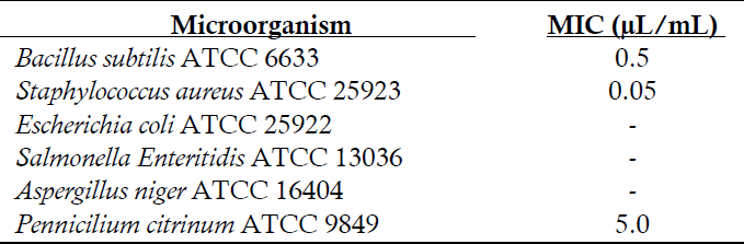 For determination of minimal inhibitory concentration (MIC) 5, 0.5, 0.05 and 0.005 μL/mL of the essential oil were placed in different test tubes and 1 mL of dimethyl sulfoxide added to each of them. One milliliter of peptone water (Mueller Hinton broth) was added followed by addition of 1 mL of 24h–culture broth of the microorganism. The test tubes were all sealed with sterile corks and subsequently incubated at 32 oC for bacteria and 25 oC for fungus during 48 h. After incubation the tubes were observed for clearance or turbidity. The tube with highest degree of clearance was taken as the MIC. Three independent tests were performed for each sample. This procedure was separately carried out for the six test microorganisms: Bacillus subtilis ATCC 6633 (G+), Staphylococcus aureus ATCC 25923 (G+), Escherichia coli ATCC 25922 (G-), Salmonella Enteritidis ATCC 13036 (G-), Aspergillus niger ATCC 16404 and Pennicilium citrinum ATCC 9849.