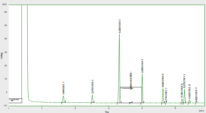El aceite de coco obtenido a escala de laboratorio está compuesto principalmente por una mezcla de ácidos grasos entre 8 y 18 átomos de carbono (Fig. 1) (Tabla 2). De ellos, los mayoritarios fueron los ácidos láurico (C12:0), mirístico (C14:0), palmítico (C16:0), oleico (C18:1), caprílico (C8:0) y cáprico (C10:0), mientras que, los minoritarios fueron los ácidos esteárico (C18:0), linoleico (C18:2), linolénico (C18:3) y palmitoleico (C16:1).