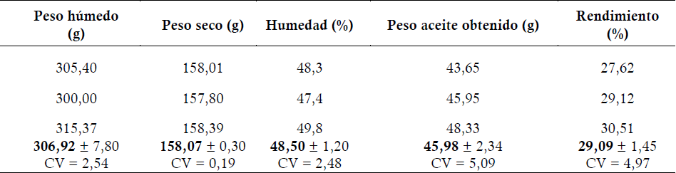 La suspensión obtenida se trasvasó a dos frascos de vidrio transparente de capacidad de 1 L y se dejó reposar a temperatura ambiente durante 20 h. Posteriormente se colocó el frasco a temperatura de 2 a 8 °C durante 4 h, y con posterioridad se colectó la masa compactada en la superficie, la cual se colocó en un recipiente de acero inoxidable. La masa compactada se calentó en una plancha de calentamiento (Corning modelo PC-420, Estados Unidos de América) a una temperatura de 80 ± 5 °C hasta que se obtuvo el aceite. El aceite obtenido se dejó enfriar hasta alcanzar la temperatura ambiente y finalmente se filtró por una membrana de 0,2 µm de trifluoroetileno para su esterilización. El aceite fue almacenado en un frasco estéril de vidrio con tapa a temperatura ambiente. Además, se determinó el rendimiento de la extracción como la relación del peso del aceite obtenido entre el peso seco de la muestra, expresado en porcentaje. Este proceso se realizó por triplicado y se determinó el promedio, la desviación estándar (DE) y el coeficiente de variación (CV) de todos los parámetros.