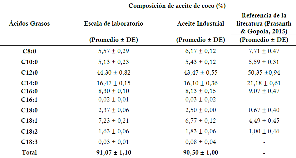 El aceite de coco obtenido a escala de laboratorio a partir de los frutos maduros se caracterizó como un líquido transparente de apariencia oleosa con olor característico de intensidad suave. Para la obtención del aceite a escala de laboratorio se utilizó la masa del coco fresca y por lo tanto se requirió de menor tiempo de exposición a elevadas temperaturas que el empleado en la producción a escala industrial de los aceites de coco obtenidos a partir de la copra (Gopola et al., 2010). Por otra parte, el rendimiento del aceite obtenido en el laboratorio (Tabla 1), se encuentra dentro del rango reportado en la literatura para el aceite de coco virgen obtenido por otros métodos (13,53 % - 46,88 %) (Wong & Hartina, 2014; Wong, 2010).