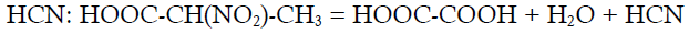 Henry reasoned correctly that lactide was composed two condensed molecules of lactic acid but gave the wrong shape to the hexacyclic compound. It was known that the oxidation of fatty and aromatic substances by nitric acid was always accompanied by the formation of HCN. Henry provided an additional example by means of the spontaneous oxidation of nitrolactic acid, HOOC-CH(NO2)-CH3 (Henry, 1879). Abandoned to itself at room temperature, nitrolactic acid decomposed abundantly into oxalic acid, water, and