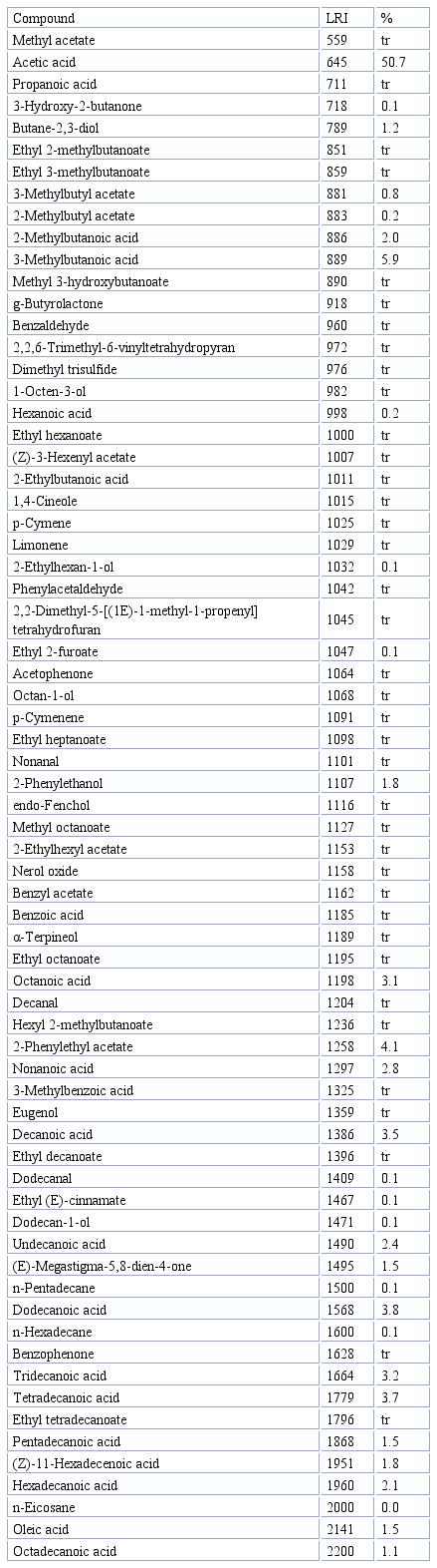The volatile compounds identified in acerola vinegar are reported in Table 1. Although the used isolation method is not suitable to determine major volatile compounds (acetaldehyde, ethanol, methanol, acetic acid and ethyl acetate), a total of 69 volatile compounds were identified.
