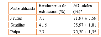 Los aceites extraídos a partir de la semilla, pulpa y fruto presentaron diferencias en sus rendimientos de extracción y contenidos de AG totales (Tablas 1 y 3). Como era de esperarse, la semilla fue la que permitió obtener el mayor rendimiento de aceite y contenido de AG totales; mientras que la pulpa, que representa un 90% del fruto, aportó el menor rendimiento de aceite y los menores contenidos de AG. En consonancia con lo anterior, el rendimiento de aceite obtenido a partir de los frutos completos fue también bajo; y la composición de AG de dicho aceite fue muy similar a la encontrada en el aceite de las semillas (Tabla 1). Estos resultados muestran que el aceite de semilla pudiera ser la mejor opción de los aceites estudiados por el alto contenido de aceite y de AG totales.