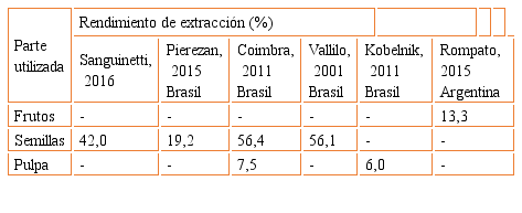 El rendimiento de extracción de aceite a partir de las semillas evaluadas, aunque inferior al encontrado por Coimbra (2011 b) y Vallilo (2001) fue superior al encontrado por Pierezan (2015) y similar al encontrado por Sanguinetti (2016) (Tabla 2), quien propone su uso como biodiesel. Los rendimientos de aceite de las pulpas y de los frutos fueron inferiores a los encontrados por otros autores (Tabla 2). Por otra parte, las semillas representaron un porcentaje del peso de los frutos (9,9 %) que fue ligeramente superior al encontrado por Goudel et al. (2013) (2,4 – 9,1 %) en frutos de palmas recolectados en Brasil, pero inferior al encontrado por Bonomo y Capeletti (2014) (33,2%) en Argentina. En todas las diferencias anteriores pueden haber influido fundamentalmente por las condiciones climáticas en las que crecieron las palmas estudiadas, los métodos de extracción del aceite, entre otras causas.
