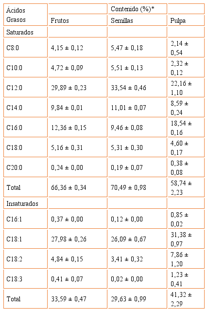 Tanto en el aceite de la semilla como en el de la pulpa se pudieron identificar y cuantificar los AG saturados caprílico (C8:0), cáprico (C10:0), láurico (C12:0), mirístico (C14:0), palmítico (C16:0), esteárico (C18:0) y araquídico (C20:0) con los ácidos láurico y mirístico como mayoritarios en la semilla y pulpa, respectivamente. Los AG insaturados encontrados en ambos aceites fueron el palmitoleico (C16:1), oleico (C18:1), linoleico (C18:2) y linolénico (C18:3) siendo el ácido oleico el mayoritario en ambas partes del fruto (Tabla 3).
