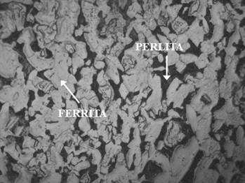 El examen metalográfico reveló que la microestructura del acero (figura 2), consta de una matriz ferrítica- perlítica obtenida mediante tratamiento térmico de normalizado. La ferrita es una fase blanda de baja resistencia con una estructura cristalina cúbica centrada en el cuerpo, en cambio la perlita es una mezcla de ferrita y cementita, en que las dos fases se forman a partir de la austenita en un patrón laminar alterno, su formación requiere un enfriamiento relativamente lento de la región austenita y depende de la composición del acero. La resistencia y la dureza de los aceros de microestructura ferrítica-perlítica, se incrementan con el contenido de perlita y más aún con la reducción del espacio interlaminar de esta.