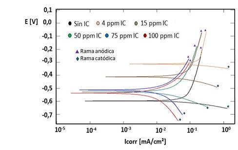 El comportamiento de las curvas de polarización expuestas en la figura 3, demuestran que la adición del IC a 50, 75 y 100 ppm, propició un desplazamiento marcado de las ramas anódicas y catódicas, en dirección al decrecimiento de las densidades de corriente (Icorr), y por tanto, a menores Vcorr, lo que se corresponde con los resultados obtenidos por la técnica de LPR.