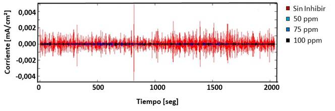El registro de corriente vs tiempo (figura 4), presentó para el sistema no inhibido, fluctuaciones rápidas de alta amplitud, representativas de un sistema bajo corrosión generalizada (Casquete, 2016). Además, se muestran puntualmente fluctuaciones marcadas de corriente, comportamiento que se atribuye a posibles eventos localizados, como picaduras, cuya causa es frecuentemente atribuida a la presencia de especies químicas como los iones de cloruros. Los registros de densidad de corriente en el tiempo con adición del inhibidor en concentraciones de 50, 75 y 100 ppm, presentaron niveles de ruido notablemente inferiores al compararse con el medio desinhibido, que se relacionan con formación de la película de inhibidor que actúa como una barrera entre la superficie metálica y el medio acuoso agresivo, lo que limita los procesos corrosivos.