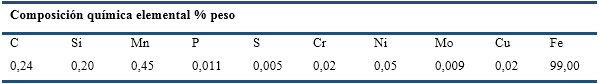 Mediante la técnica de Espectrometría de Emisión por Arco Eléctrico, se determinó la composición química elemental del acero. Se utilizó un espectrómetro multicanal digital modelo Spectrolab No.6536/94.