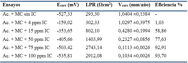 La tabla 3 muestra los datos obtenidos de la efectividad del inhibidor de corrosión (IC) a varias concentraciones, por la técnica LPR.