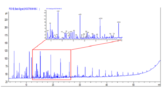 En la Figura 1 se expone, a modo de ejemplo, el perfil cromatográfico de la muestra M186 y la señalización de los componentes inter-parafínicos contenidos en la tabla 4.