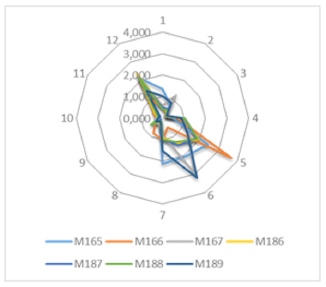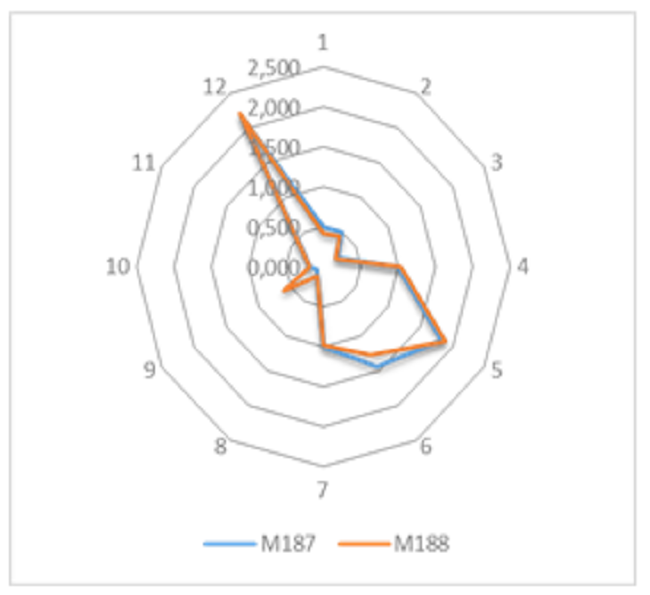 En la Tabla 7 se muestran las 12 relaciones de alturas calculadas a partir de los resultados obtenidos de las muestras estudiadas, y en la Figura 2 el diagrama estrella elaborado a partir de estas relaciones. Las muestras M187 y M188 que corresponden al mismo yacimiento, se encuentran representadas en la figura 3.