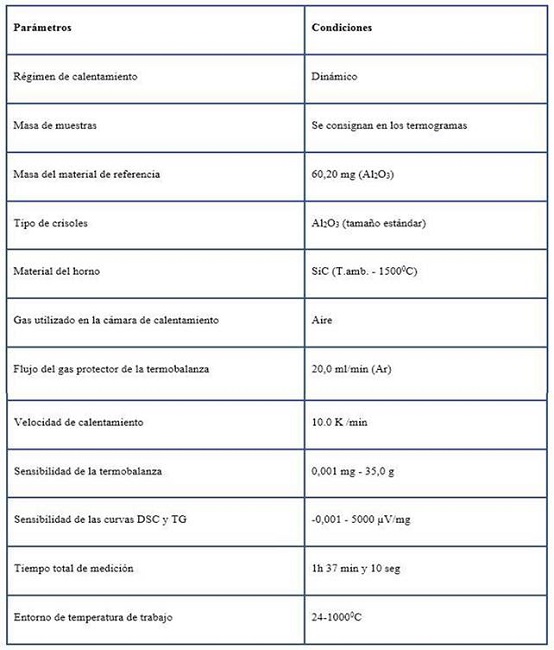 La caracterización de los productos de corrosión se realizó mediante los termogramas simultáneos de Análisis Térmico Diferencial (DTA) y Termogravimetría (TG), que se muestran en la tabla 3. Los mismos se obtuvieron en un equipo de la firma alemana NETZSCH, modelo STA 449 F3 y se emplearon para ello los siguientes parámetros de operación: