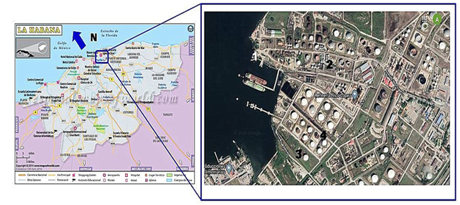 El estudio fue ejecutado en una refinería de petróleo en Cuba ubicada al sureste de la Bahía de la Habana en el municipio Regla, la cual ocupa una extensión territorial de 2.8 km². En el interior de la refinería fueron seleccionados cuatro sitios de exposición, tres bajo la condición exterior de exposición (sitios #1, #2 y #4) y el otro bajo la condición interior de exposición (sitio #3) (Fig.1). Sitio # 1. Situado en el litoral norte de la refinería en la costa en la Bahía de La Habana (Fig. 2 a). Sitio # 2. Planta uno (Fig. 2 b). Sitio # 3. Interior colocado en un almacén en la parte sur de la refinería con ventanas que dan acceso a la circulación del viento. Se trata de la condición interior de exposición bajo el efecto de abrigo ventilado (Fig. 2 c). Sitio # 4. Planta dos (Fig. 2 d).