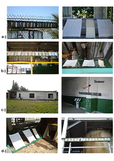En cada uno de los sitios de exposición se instalaron soportes de madera para la colocación de cuatro captadores de deposición de agentes agresivos y las 15 probetas metálicas de acero al carbono AISI-1018 (Fig. 2 a), b), c) y d). Los soportes de madera al exterior fueron colocados a una altura inferior a los 3 m en áreas techadas con acceso al viento, con el fin de protegerlos contra la lluvia. Esto evita el lavado de los agentes agresivos depositados en la superficie de los captadores.