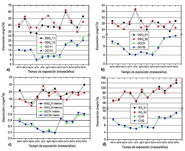 Para la condición exterior de exposición, los valores mensuales de resultaron muy superiores en comparación con los determinados para la condición interior bajo el efecto del abrigo ventilado en el almacén (Fig. 6 a), b), c) y d). Esto se debe a una mayor depocición de ambos agentes agresivos a valores elevados de