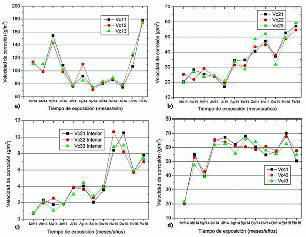 Antes de pasar a la determinación de las categorías de agresividad corrosiva de la atmósfera para el acero al carbono a ambas condiciones de exposición, es válido demostrar el comportamiento mensual de la en los cuatro sitios de exposición en la refinería. Los valores mayores mensuales fueron obtenidos en la estación de invierno (Fig. 6 a), b), c) y d).