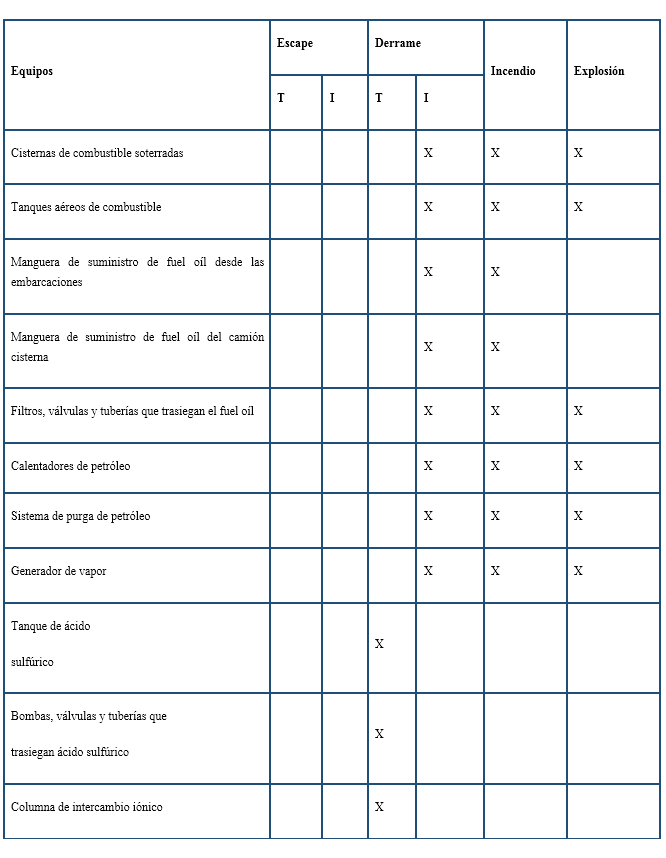En la Tabla 2, se presenta el mapa de peligros de accidentes mayores que están presentes en la CTE “Otto Parellada”, a partir de los principales equipos y aparatos que intervienen en las diferentes etapas.