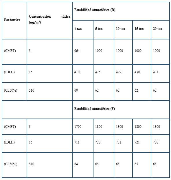 En la Tabla 3, se muestran las distancias en metros (m) que alcanzarían los distintos niveles de concentración tóxica evaluados para las diferentes cantidades de H2SO4 derramadas y clases de estabilidad atmosféricas consideradas.