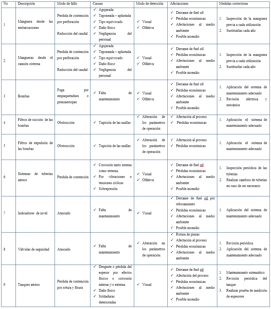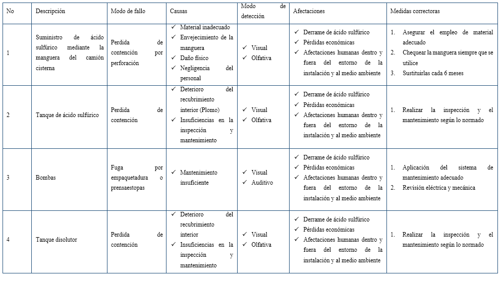 En las Tablas 4 y 5 se presentan los resultados obtenidos a partir de la aplicación del método de estudio indicado a los sistemas de ácido sulfúrico y fuel oíl respectivamente. Como puede apreciarse, los principales modos de fallos identificados están relacionados con el posible incumplimiento de los estándares y procedimientos de trabajo establecidos, deterioro físico y/o químico por corrosión de los tanques, tuberías y accesorios. Estos modos de fallos pueden incrementarse, en caso de insuficiencias en las inspecciones y revisiones, así como en el mantenimiento, fundamentalmente si no se realizan en los periodos de tiempo y con la calidad requerida.