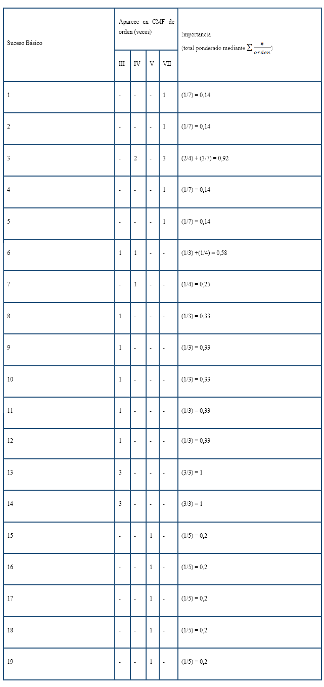 Un suceso básico que aparece en muchos CMF debe ser objeto de atención por encima de los demás debido a que está aportando a la probabilidad de fallos en muchas alternativas. Para determinar su importancia relativa, debe ponderarse el número de veces con el inverso del orden de los CMF en que aparece. Como se puede apreciar en la Tabla 6, ocupan un primer lugar en importancia los sucesos 13 y 14 o sea, el fallo del sistema de control automático del agua de alimentación y el fallo del nivostatos. El segundo lugar; el suceso 3, insuficiente inspección y mantenimiento y el tercer lugar lo ocupa el suceso 6, insuficiencias en el tratamiento químico del agua.