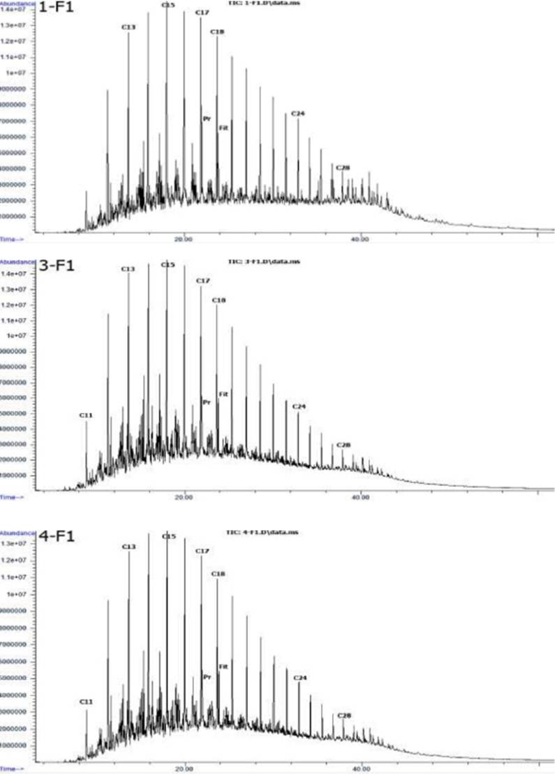 En la figura 1 se presentan los cromatogramas de iones totales (TIC, por sus siglas en inglés) adquiridos en modo SCAN. En ellos se observan los picos cromatográficos correspondientes a la elución de las n-parafinas en el rango de nC11 a nC35, además de los isoprenoides pristano y fitano. Estos cromatogramas de masas le son útiles a los geoquímicos debido a que mediante el predominio par/impar y las relaciones alcano normal/isoprenoide es posible conocer el estado de alteración además del origen de la roca madre (Wang, Z., et al., 2016, Domínguez, Z. et al., 2006, 2007, 2008).
