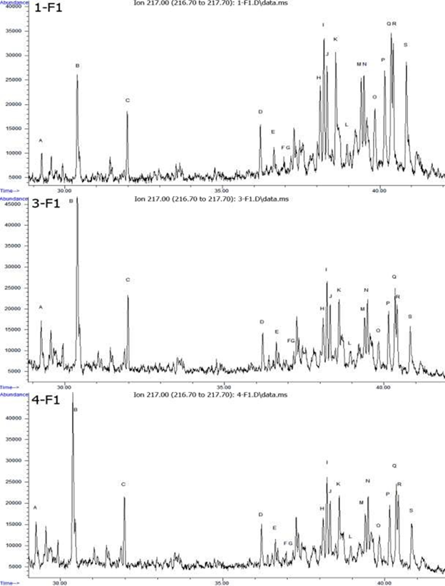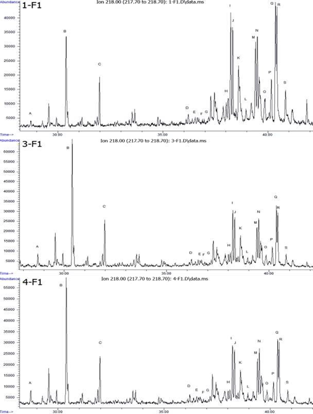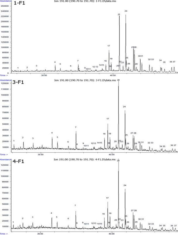 Las fracciones F1 de las muestras 1-F1, 3-F1 y 4-F1 fueron analizadas mediante CG/EM.