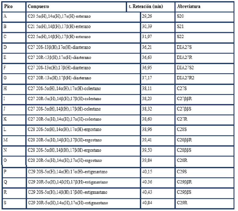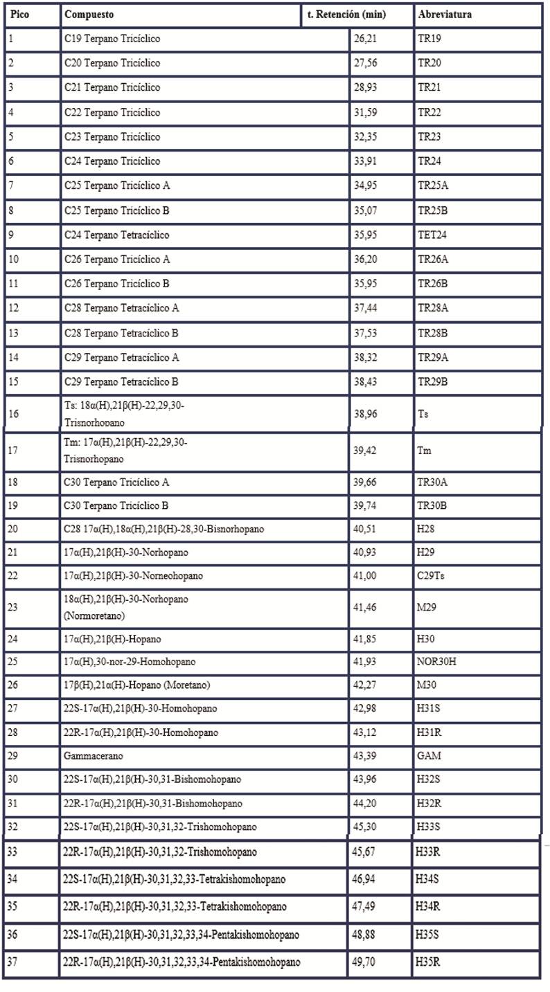 Se identificaron 37 compuestos terpanos y 19 compuestos esteranos que corresponden con los reportados en la literatura especializada (tablas 2 y 3).