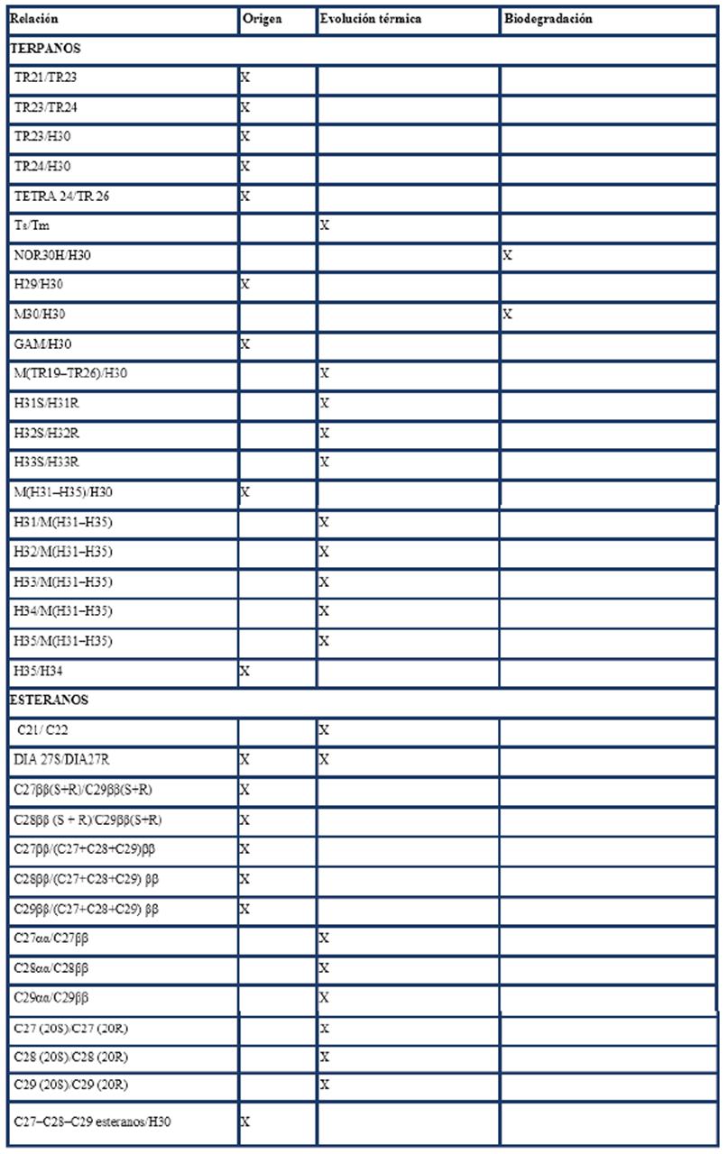 En la tabla 4 se presentan algunos parámetros utilizados frecuentemente en geoquímica orgánica y sus aplicaciones. El cálculo de ellos se efectúa a partir de relaciones de compuestos terpanos y esteranos según sus abundancias relativas (en este caso, medidas de las áreas).