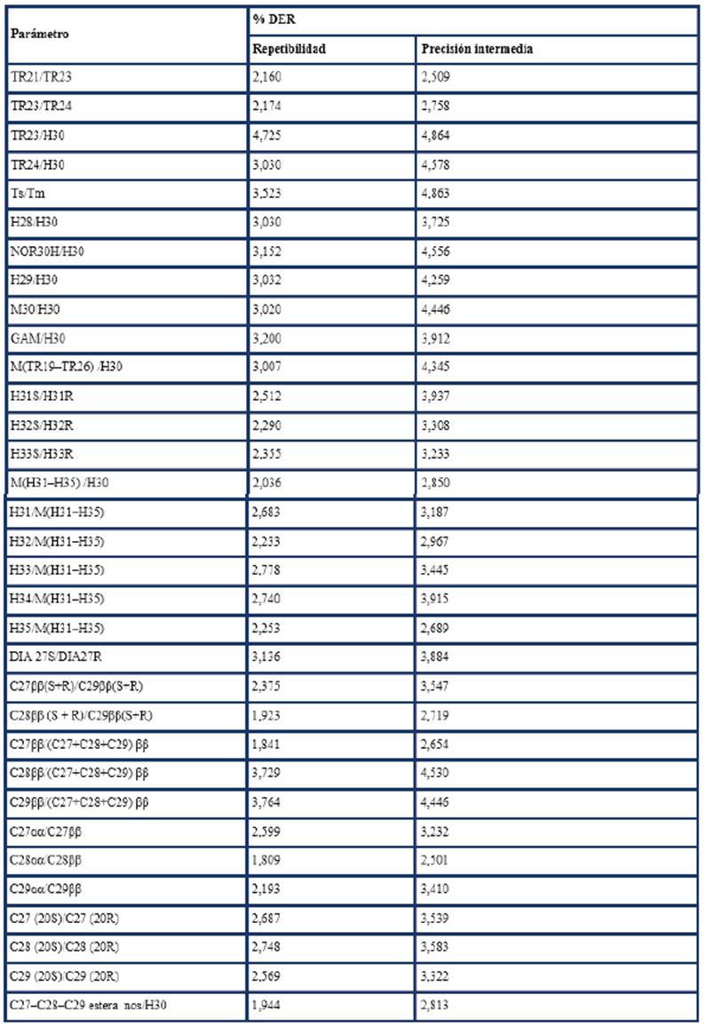 En las figuras 3 y 4 se exhiben los cromatogramas iónicos extraídos a m/z 217 y m/z 218, respectivamente. En ellas se aprecia la distribución de los compuestos entre 29 y 40 min, así como su adecuada separación y predominio de los esteranos regulares C27, C28 y C29 referidos en la tabla 3.