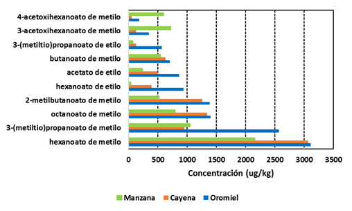 La distribución de los componentes mayoritarios (>500 (g/kg) se muestra en la Fig. 1, donde se aprecia que, aunque muchos constituyentes coinciden como mayoritarios en las tres variedades, la magnitud de sus concentraciones no es igual. Todos ellos correspondieron a ésteres y tioésteres. Las tres variedades coincidieron en tener como predominante al hexanoato de metilo, el cual posee una nota olfativa de piña (Takeoka et al., 1989; Brat et al., 2004; Montero-Calderón et al., 2010b; Pino, 2013; Pino y Aragüez, 2020; Sinuco et al., 2004; Zheng et al., 2012). Las variedades Oromiel y Manzana coincidieron en tener como segundo predominante al 3-(metiltio)-propanoato de metilo con una nota olfativa a bajas concentraciones que recuerda a la piña (Berger et al., 1985; Takeoka et al., 1989; Brat et al., 2004; Pino y Aragüez, 2020; Zheng et al., 2012), mientras que en la Cayena fue el octanoato de metilo con una nota olfativa frutal (Takeoka et al., 1989; Pino y Aragüez, 2020).