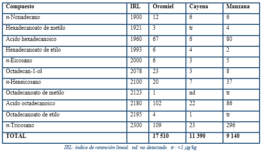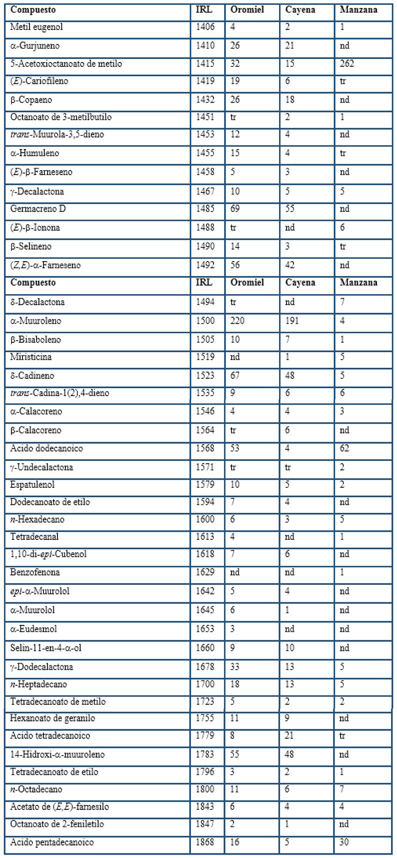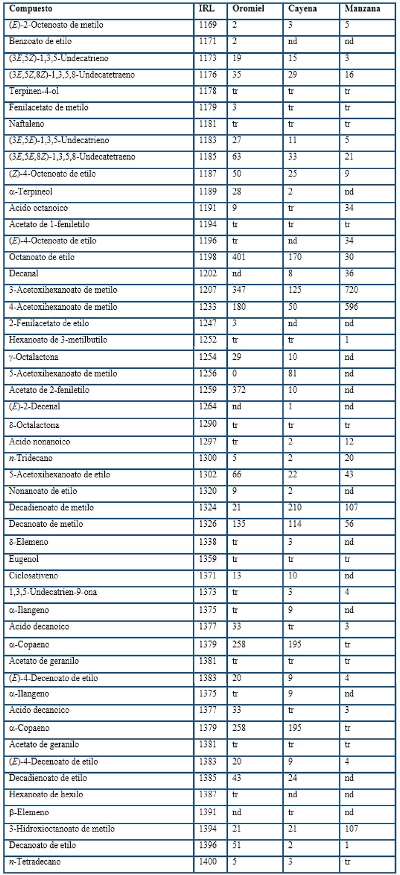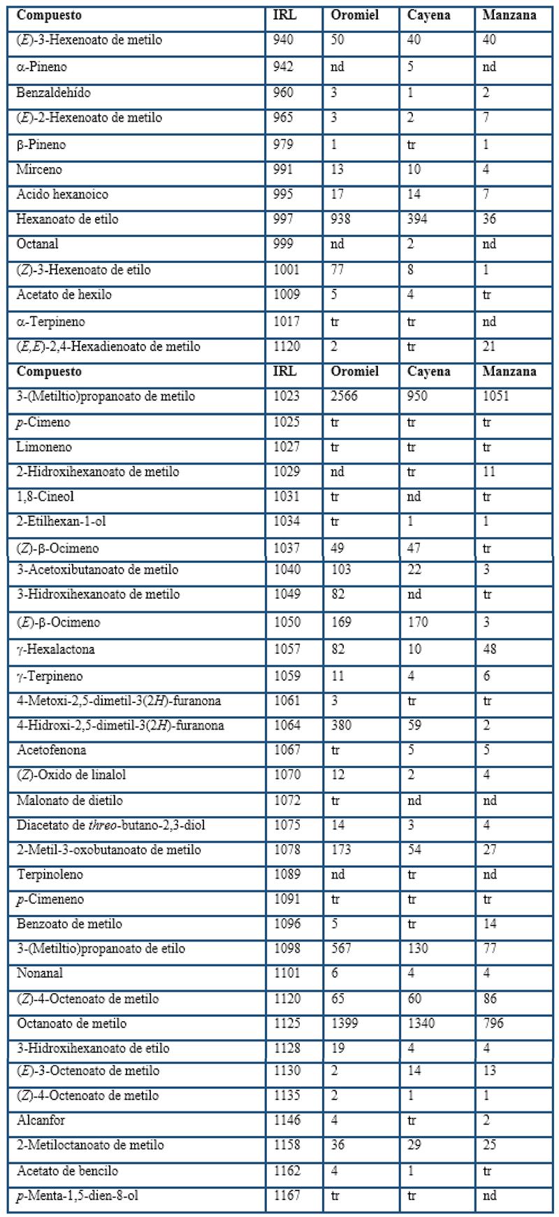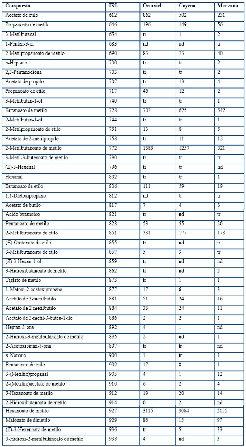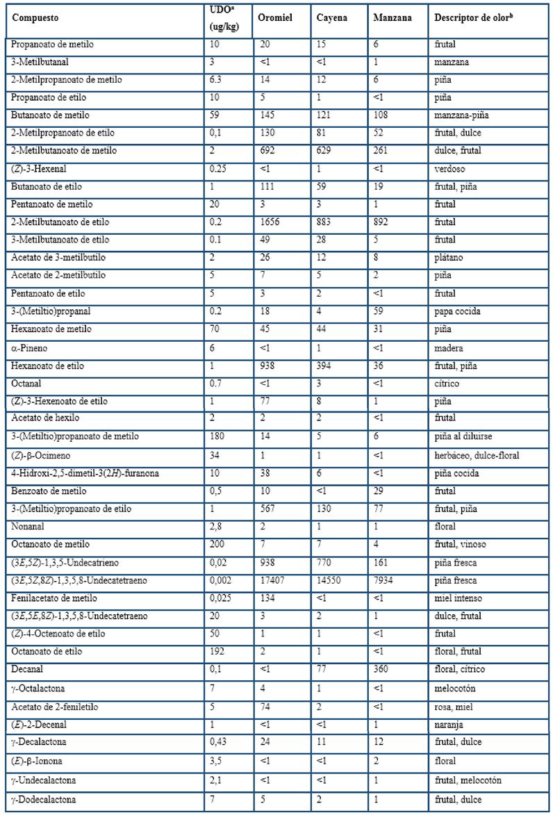 En total, fueron aislados 194 compuestos volátiles en las tres variedades, distribuidos en 183, 173 y 153 compuestos en las variedades Oromiel, Cayena y Manzana, respectivamente (Tabla 2). Este orden coincide con el contenido total de compuestos volátiles que fue 17,51; 11,39 y 9,14 mg/kg en las variedades Oromiel, Cayena y Manzana, respectivamente. La composición de los extractos estuvo constituida mayoritariamente por ésteres, seguidos de aldehídos, alcoholes, ácidos, terpenos, furanos y otros de distinta naturaleza química. Todos los compuestos han sido reportados anteriormente en esta fruta.