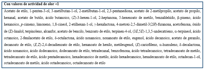 Los VAO se calcularon a partir de la relación entre la concentración y el umbral de detección de olor del compuesto. Los umbrales fueron tomados de una base de datos del Dpto. de Aromas del IIIA en La Habana (Almora et al., 2001).