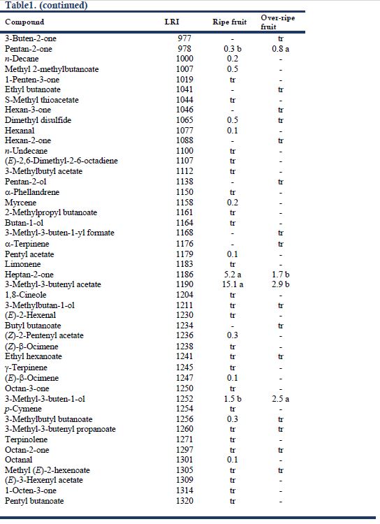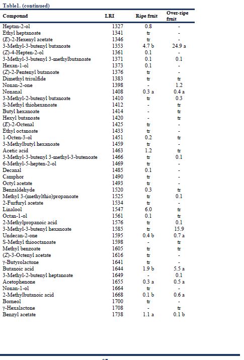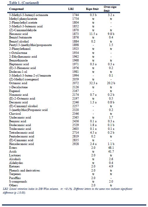 Many significant differences were found based on the quantitative distributions of the compounds in both ripening stages. According to the chemical class, major changes noticed were the increase in esters contents and a decrease in acids, aldehydes, ketones and terpenes (Table 1).