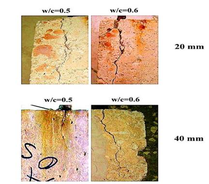 En estudios realizados en el clima tropical costero de Cuba, se ha demostrado que las categorías de agresividad corrosiva de la atmósfera entre muy elevada (C5) y extrema (CX) determinadas para el acero al carbono, cinc, cobre y aluminio a un año de estudio, se corresponden con un deterioro intenso (fisuras y grietas) en probetas de hormigón armado. Las probetas fueron colocadas durante tres años exposición ante dichas condiciones de agresividad y elaboradas con relaciones agua/cemento (w/c) 0,5 y 0,6 en un sitio de exposición situado alrededor de 20 metros de la línea costera en zonas no apantalladas (Castañeda et al, 2019). Los aceros de refuerzo fueron colocados con un espesor de recubrimiento de hormigón de 20 y 40 mm (Figura 1). Se trató de las condiciones de diseño que se usaban en la elaboración del hormigón armado para la construcción de las estructuras en zonas de elevado potencial constructivo del clima tropical costero de Cuba (Castañeda et al, 2019).