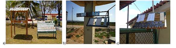 Otro aspecto importante a definir en la caracterización típica del ambiente atmosférico como primera variante de estimación de la agresividad corrosiva de la atmósfera, es el comportamiento de la deposición mensual y anual de agentes agresivos como las sales de iones cloruro y sulfato (definida también como compuestos de azufre). Se entiende por deposición a la cantidad de agentes agresivos en forma de cristales de sales o en forma de disolución salina, que se depositan en la superficie de un captador o material metálico, mientras el aerosol marino continúa penetrando desde el mar hacia el interior de la tierra, a partir de su flujo horizontal (Meira et al, 2008). Diferentes tipos de captadores y dispositivos, se vienen usando a nivel mundial para la determinación de la deposición de los agentes agresivos en estudios de corrosión atmosférica (Howland y Castañeda, 2017). En los últimos años se ha venido usando en Cuba, el paño seco para la determinación de la deposición de las sales de iones cloruro (320 x 220 mm) y el captador de placa filtrante de celulosa (filtrasita: 150 x 100 mm) para la determinación de los iones sulfatos o compuestos de azufre. Los soportes donde son colocados los captadores deben ir ubicados en una caseta con techos a dos aguas o en zonas donde no le impacte la lluvia caída a una altura no inferior de 3 m (Figuras 2 a), b) y c). De esta manera se evita el lavado de los agentes agresivos en la superficie de cada captador.